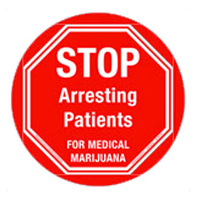 White on red celluloid button with safety pin back. Button reads “Stop Arresting Patients for Medical Marijuana".
